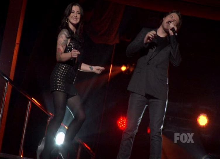 8:03: the top 12 team up with the stars of "So You Think You Can Dance?" for our evening's first group song, opening with "Get Ready." Our dance-averse finalists seem to actually be moving with something vaguely resembling choreography. (At the very least, it's "Brady Bunch" Silver Platters-worthy choreography, though the "SYTYCD"ers predictably outshine them.) What's up with that? Also, why is Kristy Lee Cook front and center for the Motown song?