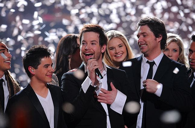 9:59: The accountant certifies the results, Ryan wishes them both luck, and the winner, by 12 million votes, is David Cook!!!!!! Sorry, gonna be impartial for a second. Yes!!!! A total breaking-the-mold choice, proof that you can show actual musicianship and creativity on this show and succeed, and, perhaps best of all, a repudiation of Randy Jackson.