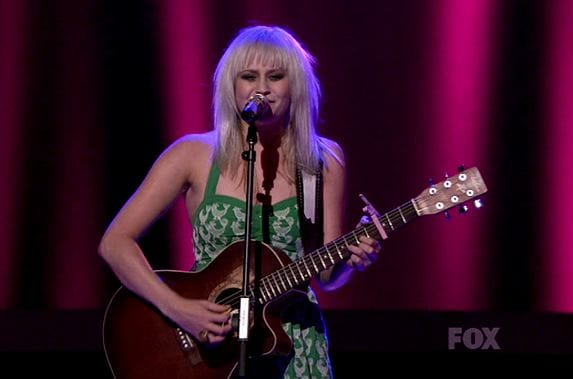 I thought Lilly Scott was wonderful; even if it turns out she used someone else's cover of "Fixing a Hole," as David Cook so often did covers-of-covers during his season, I love her voice and stage presence. And there were several other songs that were well and confidently performed, even if they were all much more karaoke and therefore my enjoyment depended largely on whether I enjoyed that particular song or artist being covered (Crystal Bowersox doing Alanis(*), Didi Benami doing Ingrid Michelson) or didn't (Michelle Delamor doing the show's umpteenth Alicia Keys impression). There were also a bunch of performances that were all over the map, some of which I ultimately sort of liked (Haeley Vaughn's "I Want To Hold Your Hand" started off sounding like the version from "Across the Universe" and then got weird, quickly), some less so (Lacey Brown's "Landslide"). Overall, though, I really only care about ever hearing Lilly, Crystal and Didi again, preferably in some kind of all-guitars Top 4 with Andrew Garcia.