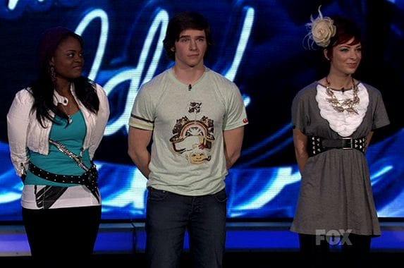 One slight improvement to the Save: instead of having to sing the song that got them the least votes the night before, the contestants are apparently allowed to pick any song they've done so far this season (I'm sure they tell the band in advance which one they'll do if it's their turn). The whole thing's still totally bogus, but this at least makes the lie seem more plausible.