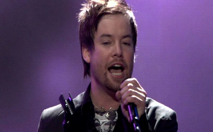 David Cook, "I Don't Want To Miss a Thing": "One of the greatest songs of all time"?!?!?! Really, Simon? I get that he's on the panel not because he has great taste but because he has great instincts for what will sell, but this song is a massive, artery-clogging piece of cheese. The arrangement's not quite the same as the original, which is probably a good thing, because Steven Tyler is a sort of male equivalent of Whitney for this show (see what happened to Michael Johns with "Dream On"). That said, it felt, again, like the same performance David's given us for a few months now. At a baseline level, I vastly prefer David C's schtick to David A's, but the longer the season goes on, the more he starts to seem like yet another "Idol" one-trick pony.