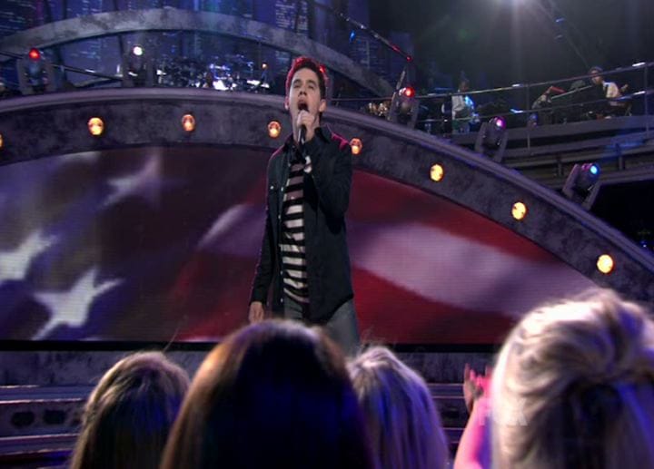 David Archuleta, "Sweet Caroline" & "America": David badly needed to do some more uptemp songs -- the last non-ballad he sang was in the first week of the semis -- and yet he found a way to turn "Sweet Caroline" into another inspirational tune about the importance of touching other people and being touched in return. Even with the faster pace, it's amazing how much it resembled every other Archuleta performance. As for "America," I mentioned the cat strangling already, but I'll give him credit for doing something that didn't remind me of all his previous performances. Maybe I was just dazzled by the American flag display and him doing the "My Country 'Tis of Thee" portion of the lyrics, or maybe I just hypnotized myself into imagining the song as sung by Michael or Carly if they were still around, but at least it didn't put me to sleep.