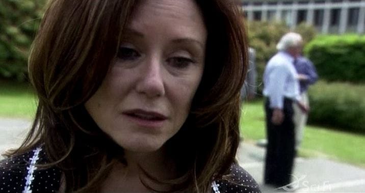 And as I watched Laura step into her favorite fountain (last glimpsed, I believe, during her hallucinations in "Epiphanies") and let its water wash over her tears, and as I watched her carefully eating sushi and trying to act normal three months later, I began to wonder if maybe the grand plan for these characters isn't quite as grand as some of us want to believe. Maybe the reason that these are the people who have survived everything the Cylons have had to throw at them -- beyond luck, of course -- isn't a matter of destiny, or the work of the Cylon God, or any other metaphysical force. Maybe these are just the people who are gods-damned tough enough to take everything the last four years has thrown at them and keep on going. Maybe Laura Roslin has been able to keep it together after all this time because she already had her world taken away before the Cylons came back. Maybe she calls on the memory of that day the two cops came to her door when she needs to find the strength to get up off her death bed and hobble down to the flight deck, even though she can barely stand or speak, because she's not going to let her second family leave without her.