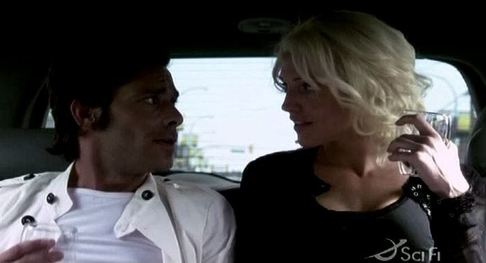 • I also found it interesting that Helo didn't seem that mad at Tyrol for his role in Hera's kidnapping. (There were apparently some deleted scenes from "Islanded in a Sea of Stars" that showed how Tyrol wound up in the brig.) Helo's barely holding it together, and the only way he can rationalize what's happened is to compare Tyrol's relationship with an Eight to his own, even though Athena is everything he's always believed her to be, while Boomer's loyalties are ever-shifting.
