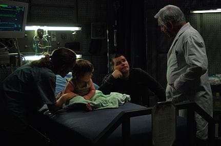 The other practical matters to be dealt with here are questions of paternity. Tigh is, in fact, Caprica Six's baby daddy, which means that Cylon-Cylon breeding is somehow possible (and it would have to be, given the number and variety of Cylons we saw in the flashbacks to Earth pre-nuking).