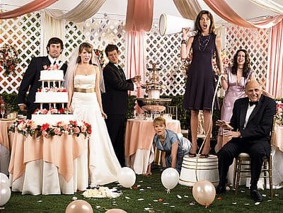 So we have an argument between father and daughter over the groom's decision to walk down the aisle to the theme from "What's Happening!!," a wedding in a neighboring town that's cornered the market on both photographers and romaine lettuce, two ushers with respective crushes on the bride and groom, a tent that's useless against both the rain and wind, and a wedding planner who always looks five seconds away from taking hostages.
