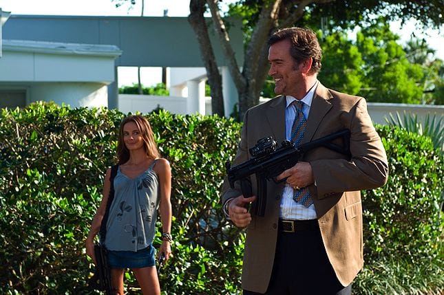 In some ways, in fact, I'd call this year an improvement. Now that the characters and premise are firmly established, the writers have dropped the idea that Sam can't stand Fiona and vice versa, and it's been fun watching the two of them and Michael work so well together -- and take such pleasure in their work. (Dig the smile on Bruce Campbell in that picture above.) And letting Michael's mom in on his work life -- or, at least, acknowledging that she knew about it -- has made that character much more palatable and interesting.