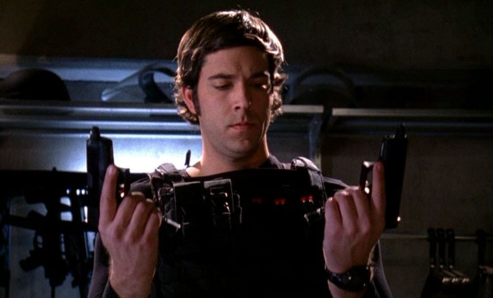 But any concerns I had about the plot holes started to waver when Chuck combat suit-ed up for the first time, and they vanished altogether once Chuck's dad turned up at Roark and took out Vincent(**), Orion-style. It was a moment a lot of us assumed was coming, but it was so well-executed in every phase -- from the "Princess Bride"-esque exchange quoted above to the way Scott Bakula effortlessly flipped the switch from crazy and ineffectual Stephen to vigilante genius Orion -- that the lack of surprise didn't matter.