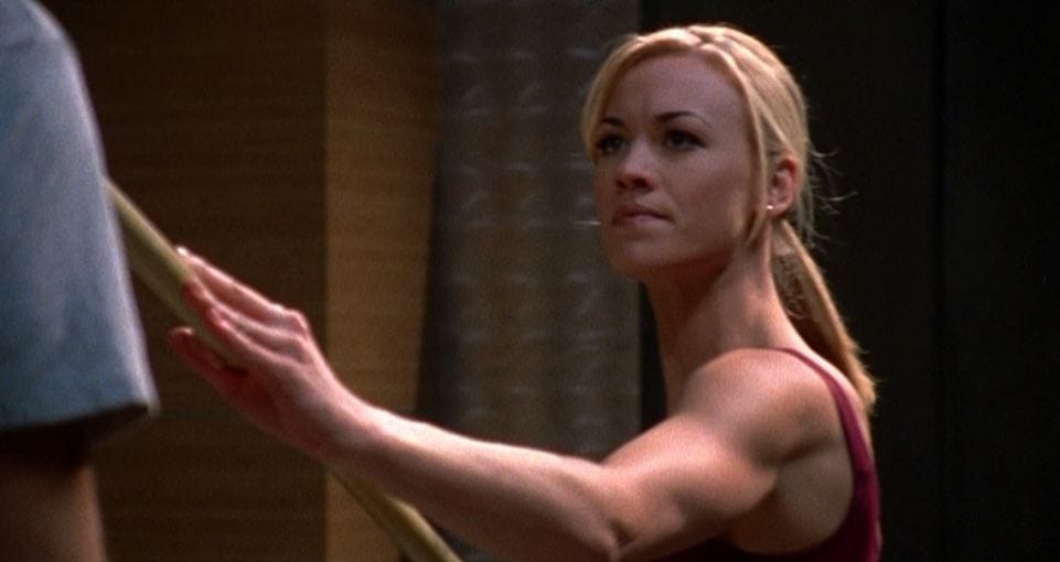I say "almost" because we followed up on the heist on Karl's safe with one of my single favorite scenes of the series: Chuck and Sarah practicing their bo staff work at their underground HQ, Chuck trying to talk to Sarah about what happened in Prague, Sarah venting her anger at Chuck because he made her drop her guard and let herself get hurt (even as she denies it). Great work from Levi and Strahovski (this stuff's her specialty), and in isolation, I believe this latest fork in the road for the two, just as I did when Bryce came back, or when Jill did, etc., etc. It's the sum total of things - and the clear sense that this is being done because this is how people think it's supposed to be done - that becomes the issue.