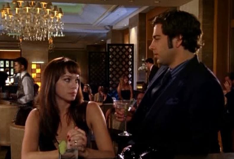 Now, much as I liked Larroquette (particularly the Photoshopped montage of Roan in his swinging heyday), the real scene-stealing guest star was Josh Schwartz's cougar muse Melinda Clarke as the Black Widow. Chuck giving Sasha Banachek the full Bartowski treatment (asking her what bands she's into, reciting the history of the croissant) would have been amusing enough with any beautiful woman sitting opposite him, but Clarke's bored demeanor and the relish with which she said "Make mad passionate sex to me" were really choice. I hope there's some opportunity for both guest stars to come back at some point.
