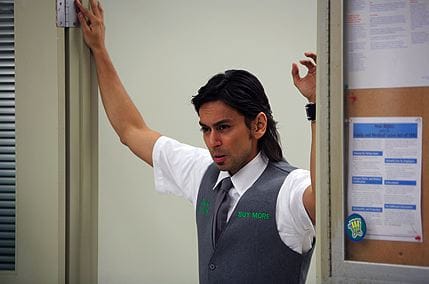 • Yes, by this point the number of Buy More shoot outs is getting absurd, but without this latest one, we wouldn't have gotten the funniest joke of the episode: Big Mike looking up at the mangled banner, now reading "New Ass Man," and muttering, "I ain't new!"