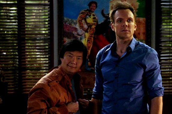 Beyond that, "Environmental Science" was just a nice showcase for virtually everyone in the cast, including Ken Jeong. Jeong was added after the pilot (no doubt due to his performance in "The Hangover"), and there have been times where he's either felt shoehorned into episodes, or else working in a style that's just a little too broad for the room. But he melded very well with Joel McHale, and the opening classroom scene - from pulling Annie, desk and all, out into the hall to lengthening the paper in response to Britta's ass-kissing - was the best of those since Chang's debut scene in episode two.