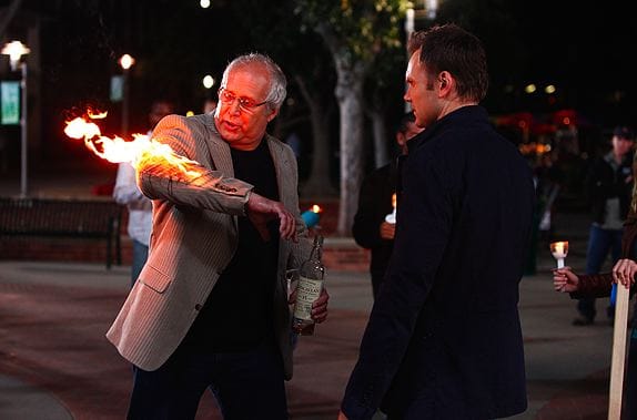 In addition to the hysterical Senor Chang scene ("Use your hands! It's 90 percent of Spanish!"), "Spanish 101" was a great showcase for Chevy Chase as Pierce. As with his guest stint on "Chuck" last season, I think there's a danger at this stage of Chevy's career that the writers who grew up worshiping him in movies like "Caddyshack" and "Fletch" will just assume that his mere presence is an automatic laugh-riot, as he wasn't one of the stronger parts of the pilot. But just as the "Chuck" writers started giving Chevy funny material to play, "Spanish 101" makes it clear just how disconnected Pierce is from reality, in mostly funny but occasionally sweet ways. I'm still laughing at the notion that Pierce's skit was both homophobic and "surprisingly and specifically critical of Israel"(*), and laughing even harder at the montage of Jeff and Pierce's presentation, ironically scored to Aimee Mann's "Wise Up," which has become a cliche choice to accompany extremely earnest movie montages. I can't decide my favorite image: Chevy and Joel McHale in the tiny hats, the afro wigs (a "Fletch" homage?), or the robots. But it was wonderful throughout.