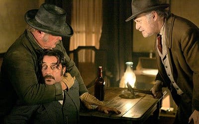 While Al may insist "I'm having mine served cold" (who knew Klingon proverbs were so popular in the Old West?), I'm damned curious to see how the show deals with this conflict. While Milch has introduced some fictional characters like Alma and fiddled with the personal details of real ones like Bullock (Martha was never married to his brother, and they had a daughter who never got horse-trampled), he's not going to make a radical break with history by having Al or Dan execute George Hearst. Since I've seen the next three episodes, I won't speculate too much, but Hearst is the first opponent who's dramatically won the upper hand over Al. Al was so confident that Hearst and the Captain wouldn't try anything -- or that, if they did, he could stab his way out -- that he went over there solo, and didn't even attempt to signal to Dan and the guys when they forced him inside at gunpoint. And if Al is going to win even some small measure of revenge over Hearst, he's going to have to follow his own advice to Dan -- "Change calls the tune we dance to." -- and stop thinking like he can out-think and out-tough anyone.