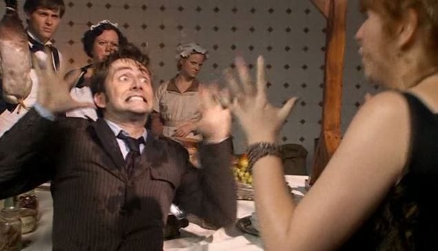 And yet, the entire episode was almost worth it just for another game of Doctor/Donna pantomime. For the most part, the writers haven't tried to re-jigger the show to showcase Catherine Tate's comic side, but I get a kick out of occasional moments like their re-introduction in "Partners in Crime" or, here, Donna being the world's worst Charades partner during The Doctor's attempt to un-poison himself.