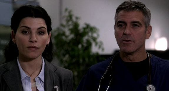 Because Clooney's so famous now, the Doug and Carol portion of the episode could have easily slipped out of the reality of the show, especially with Clooney working alongside Susan Sarandon. (Ernest Borgnine, our third Oscar winner of the night, had to content himself with working with John Stamos and Shiri Appleby.) But Clooney's a very good actor as well as a charismatic star, and the storyline was done in such a low-key fashion that it never felt like the return of the conquering hero. Slip him into a pair of scrubs, put his hair back into the old caesar cut, and he's Doug. Easy.