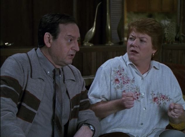 Bill's mom Gloria comes home from her waitress job (her stripping days are long behind her) and tells Bill that a male friend will be joining them for dinner. You can tell by the way Bill asks "Another new friend?" that this isn't a new phenomenon, just as you can tell it's something he's not crazy about. In a great little moment, Gloria says Bill knows this man, Bill guesses that it's Neal's dad, and Gloria briefly turns back into a 16-year-old, snorting, laughing and saying, "Vic Schweiber? No! Gross!" Instead, the man in question is Coach Fredricks, news of which sends Bill into a tizzy. "He's a jerk!" he tells her. "He's a dumb jock!... You gotta, you gotta, you gotta dump him."