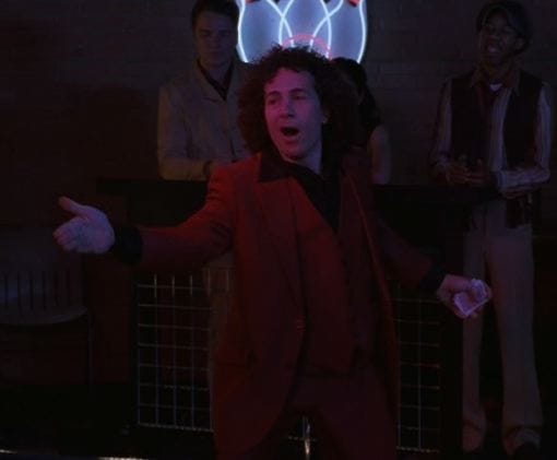 And even if Nick's dancing gets a little too sad for Apatow's liking, the button to this subplot is so hysterical on its own that all should be forgiven. After Nick's turn is over, he's replaced by "the magical disco stylings of Eugene," a floppy-haired, leisure suit-wearing guy who doesn't so much dance as do a little mime and then start pulling out scarves, canes and playing cards for various tricks. The crowd eats it up, and as Nick sees even this hollow victory slipping away, he protests, "They didn't say you were allowed to do magic!" (As if he would have been able to had he just been allowed.) Sara then commits the cardinal girlfriend sin of rooting for the other guy, saying of Eugene, "Wow. He's really good." (Check the look of disgust on Nick's face in reaction to that; as if he didn't already hate this relationship enough, you know?)
