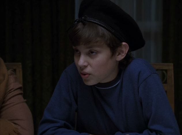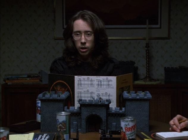 Another lovely little touch: the beret Sam wears while playing D&D. (Also, even though Sam keeps the other geeks hanging about his involvement until the last minute, they wind up playing the game at his house; chalk that one up to the Weir dining room being one of the show's standing sets, I guess.)