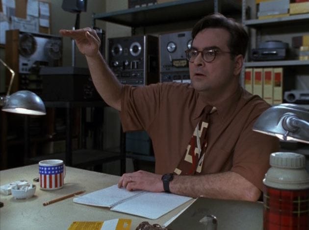 - And speaking of Hodgson, I've neglected until now to mention that one of his "MST3K" co-stars, Trace Beaulieu, appeared repeatedly on this series as the biology teacher, Mr. Lacovara. He has a very funny moment here in the cafeteria, where after assuring Lindsay that attending the summit put him on the path to his current level of success, he turns and knocks over a student's lunch tray. As the students all jeer, he raises his hand and says, "That was me! I'm a clumsy clod!" in an overly-cheerful way that suggests he suffered many such humiliations when he was younger before learning that self-deprecation is the only way to survive them. (God, this show was great with the little moments like that, wasn't it?)