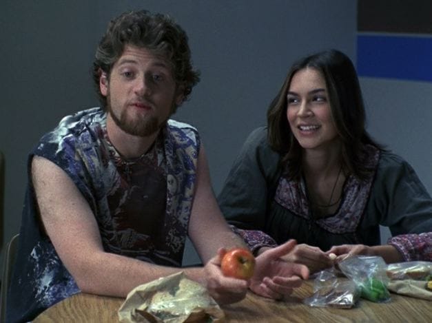 At the cafeteria, the Deadheads tell Lindsay stories of following the Dead around on tour. Deadhead Samaire talks about a show in Jersey where it started raining, and everyone danced in the mud, and when a rainbow fell over the stage, "I started crying." (The funny thing is, Samaire sounds exactly like she does when she's not playing a stoned character.) The male Deadhead pulls a Gordon Crisp and puts the culture into language Lindsay can get behind: "It's about being together and having a good time... Judging has nothing to do with it. That's not what the Dead are about. It's about being connected and being free." They intend to spend a week and a half after school ends following the Dead from Texas to Colorado, and when Lindsay sheepishly explains she won't be able to go because of the academic summit, they cement their position as her new idols by not judging her about it, saying, "You gotta do what you gotta do."