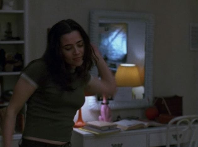 (Watching the episode in chronological order, we then spend a while with Lindsay and Nick at the bowling alley, but when I sorted my notes by storyline, I was struck by the fact that the Kim scene leads directly into the next one. I've always wondered how much of Lindsay's decision has to do with her desire to escape her brainy good girl image once and for all and how much is her trying to help out best pal Kim. I think it's probably 70-30 image reinvention, but I could be persuaded to change that ratio.)