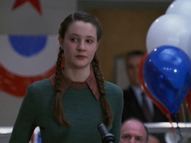 "No, Sam," she tells him in complete disbelief. "You can't break up with me. You're supposed to be nice. That's the only reason I'm going out with you in the first place!" Sam points out that he, in fact, is a nice guy, but they have nothing in common and they're not having any fun. Cindy admits this is true, but she can't deal with the humiliation of being dumped by her nerdy rebound guy, so she throws the necklace at him and storms off. (Our final glimpse -- ever -- of Ms. Sanders is her all red-eyed and unrecognizable as she introduces a future Commander in Chief.) Neal and Bill wander over for moral support, and Neal's enough of a friend to tell Sam he did the right thing. Bill asks if this means Sam will go back to eating lunch with them, and when Sam says yes, Bill says, "Thank God."
