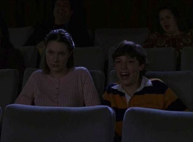 And then, disaster on every level. At the movie theater, Cindy hates the necklace, both because it's old and not her style, and because Sam didn't spend any money on it. (With Cindy, it's not the thought that counts.) But you know what she hates even more? "The Jerk." While Sam is laughing uproariously at the legendary "He hates these cans!" scene, Cindy's putting on the lemon face to end all lemon faces. Sam notices Cindy's displeasure and offers to buy her popcorn. "Will popcorn make this movie funnier?" she asks, her voice dripping with scorn. This in turn pisses off Sam so obviously that even Cindy realizes she's gone too far with her boytoy, so she tries to distract him with a hickey, which only annoys him more. (Nothing like a girl you've grown to loathe trying to give you a hematoma.)