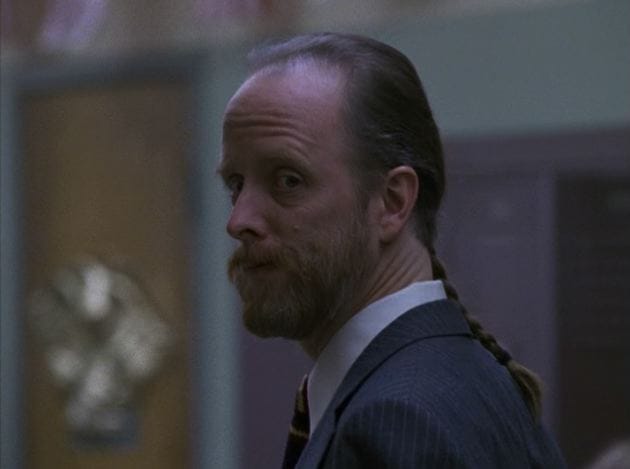 The day of the assembly, Lindsay's impressed to see Rosso all cleaned up in a suit, his hair pulled back into a neat braid. He apologizes for his parking lot meltdown and feigns enthusiasm about the VP's visit, but Agent Meara bars him from entering the cafeteria because he's on the mailing list of some questionable organization. As Meara escorts him to a "holding area" (really Rosso's own office), Mr. Rosso shoots Lindsay a beautiful, knowing look that makes it clear exactly what she needs to do.