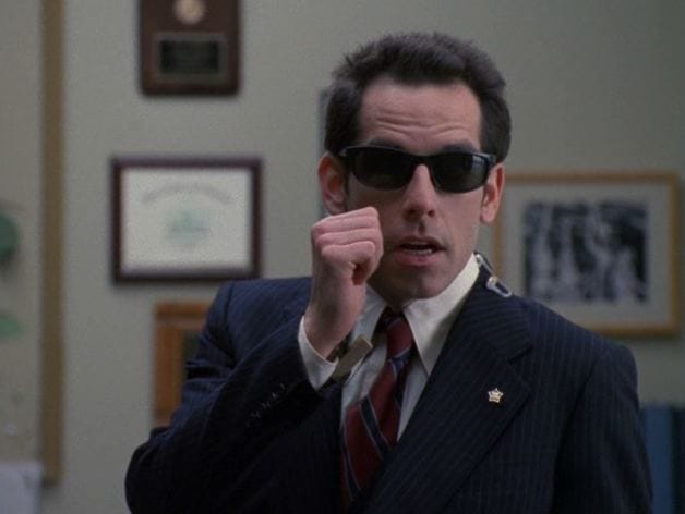 Rosso proudly tells Lindsay that she's been selected to ask VP Bush the first question in the informal cafeteria Q&A and is bewildered that Lindsay seems so unhappy with this honor. She notes that she's a Democrat, and he responds that they live in a country where you're supposed to question your leaders, but "I guess me and all my hippie friends were just wasting our time at Berkeley." He finally gets her into the spirit of things by explaining that she's special (not in the Eli way) and destined to be around world leaders. At seeing Lindsay's excited face, he utters the "I've got the best job in the world!" line that was cut from the end of the pilot as being too ironic. Before he can bask in the moment, a Secret Service agent -- played by Apatow's old boss, Ben Stiller -- enters and explains that they're commandeering his office as a workspace until the VP's visit is over. As Rosso walks out, Agent Meara (named for Ben's momma) keys his mic and requests a background check on this teacher, who he describes as "about 6'3," a real Dr. Feelgood look."