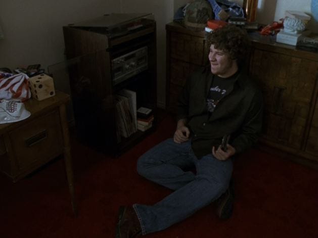 The freaks are hanging around at night, and Ken reads way too much into Daniel greeting him and Amy with "Hey, guys," demanding to know what Daniel meant by that and then punching him in the face. Amy, realizing that Ken told the others her secret, runs off and refuses to let him in to explain when he comes tapping on her bedroom window. In a very nice little moment scored to Jackson Browne's "The Road," Ken starts walking home alone from Amy's house; Daniel pulls up in his Trans Am and sheepishly offers to drive Ken home. Not a word is said about the punch, or about the earlier conversation in Nick's basement; nothing needs to be said.