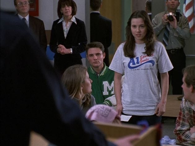 At the assembly, a tearful Cindy Sanders walks off and Lindsay rises nervously in her A1 t-shirt to ask the first question. As her parents gaze proudly at her, she says, "Mr. Vice-President, my name is Lindsay Weir. My dad owns A1 Sporting Goods on 16 Mile Road. My question is... why did your staff reject my question? Are you afraid of an open discourse with the students?" (Really, it's the best possible question she could have asked; if anything's going to make the ineffectual vice-president look bad, it's an attempted cover-up at a high school assembly.) Rosso is listening on the PA as Meara goes through the test ("Do you like working with major appliances?") and, smiling like the proud papa that Harold resembled moments earlier, calls Lindsay "One of McKinley's finest." You know, sometimes that job's not so bad, is it?