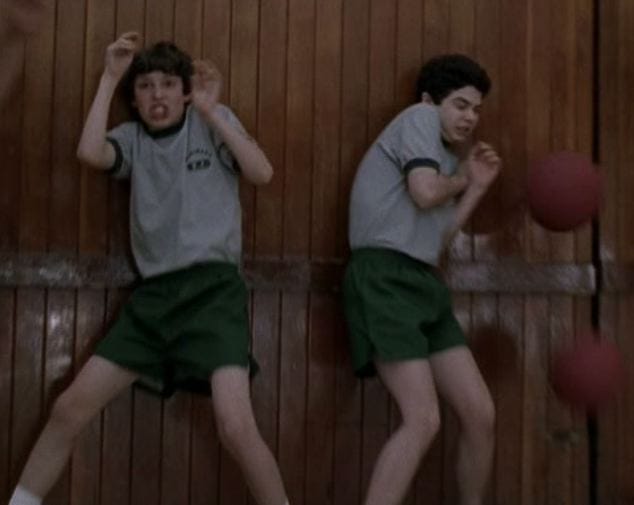 Feig was, like me, a geek, and so the pilot's sensibilities tilt ever so slightly towards Sam and his pals instead of Lindsay's budding friendship with Daniel and company. There's a brilliant scene where Cindy brings Sam the jacket he left in another room -- having no doubt put no thought into the deed beyond, "Hey, isn't that Sam's jacket? I should probably get it for him." -- and Neal and Bill contort themselves into a logic that interprets this as proof that Cindy's in love with Sam. And the episode's centerpiece is the dodgeball game (pictured above), shot like the Normandy sequence from "Saving Private Ryan," with nearly as much carnage. (Neal takes a shot in the jewels twice.)