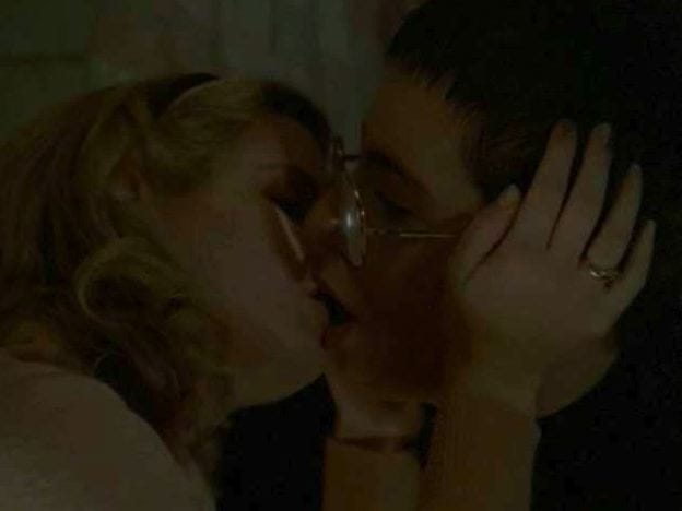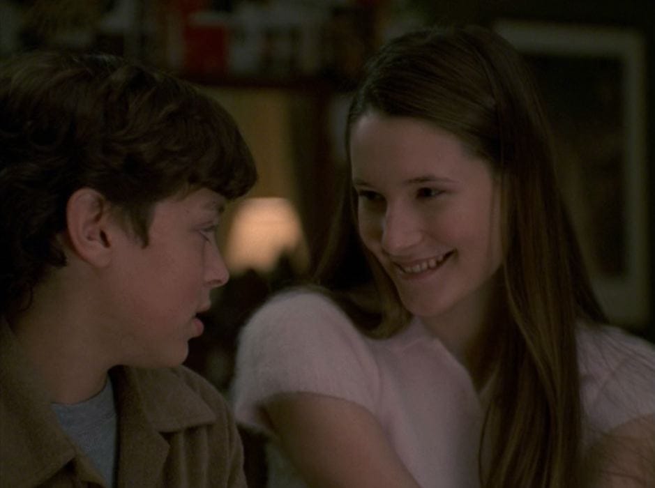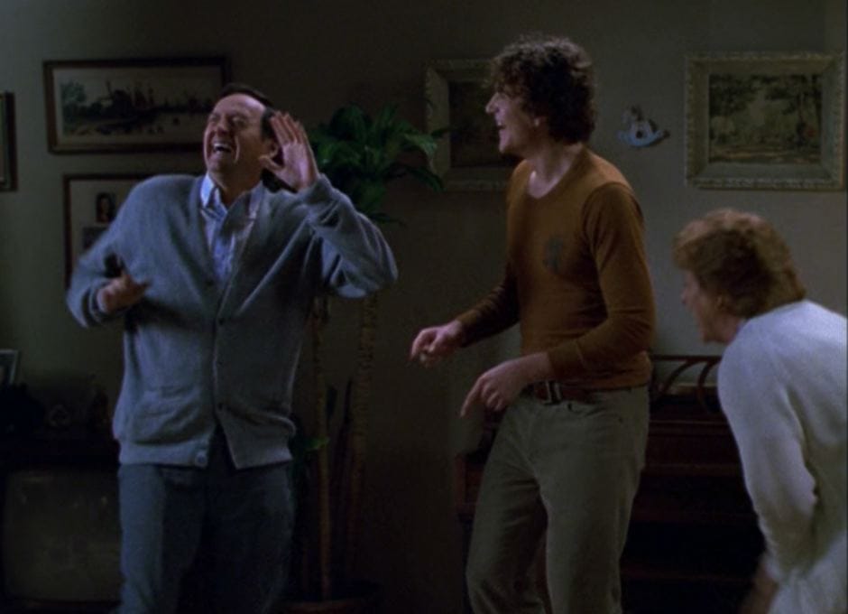 Cindy and Sam, meanwhile, are upstairs. Sam remains at Defcon 1, but he's trying his best, first suggesting they pick a bedroom to "talk or something," then putting on the radio in search of some good make-out music, and finally asking Cindy for permission to kiss her; she smiles and says, "Of course." (It's a move that also worked for Ken in "The Garage Door." Maybe Daniel shouldn't trash talk it so much.) They finally have a real kiss, and then Cindy once again establishes that she wears the pants in this relationship by shoving Sam down onto the bed and turning off the light. The last thing we see is an expression of pure terror on Sam's face. Poor Sam's built the idea of dating Cindy up so high that he can't enjoy it even at this early stage. (Also, Cindy's kinda scary like this.)