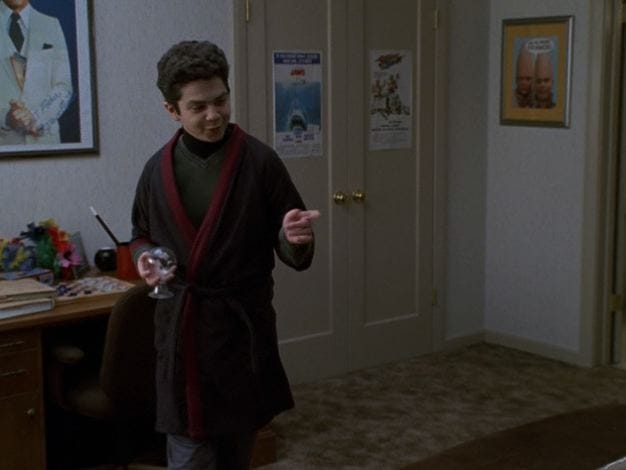 Neal decides to give Bill a Spin the Bottle tutorial (and there are no special effects involved; Samm Levine took that bottle home to practice with it for hours), and Bill admits his aversion to kissing has nothing to do with hygiene, but with his very prescient fear that girls won't want to kiss him. He'd rather not go to the party than see a girl look disappointed (or worse) if Bill's bottle points at them. Neal tries to reassure him, and in a funny ad lib (Levine forgot the line, but his flub was funnier than what had been written), answers Bill's question about whether people French kiss during the game by saying, "Some do. Most don't. I do." This then leads to our first Bob Seger montage of the evening, as the geeks get ready to the tune of "Katmandu": Bill obsessively brushes his teeth and experiments with tongue positions in the mirror, Sam ponders fashion disasters like a clip-on tie and the Parisian night suit, and, in maybe the funniest (and/or creepiest) thing Samm Levine ever did on the show, Neal emerges from his bathroom in a smoking jacket, holding a brandy snifter and trying to act all Hugh Hefner for the benefit of Morty the ventriliquist's dummy, whom he proceeds to kiss.