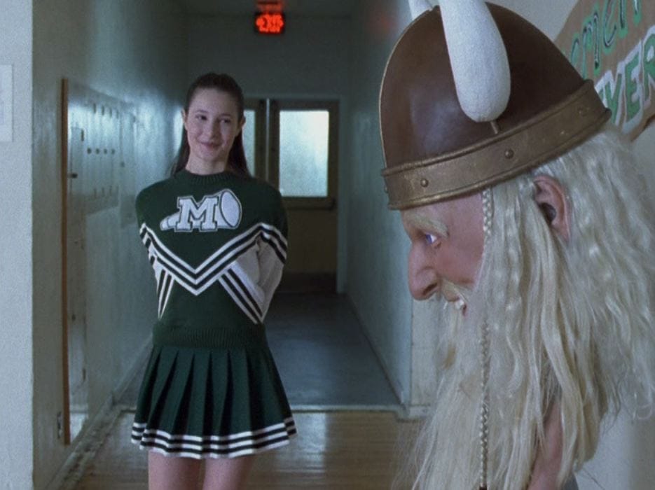 When Herbert, a freshman who plays the team's Viking mascot, breaks his arm during a pep rally in the cafeteria, the cheerleaders -- led by Type-A whip cracker Vicki Appleby -- hold open auditions for a new Viking. Sam wants to do it to impress Cindy. Neal wants to do it because he thinks Herbert's been wasting the comic potential of being a little guy with a giant Viking head. (Herbert, who spends most of the episode on the verge of collapse because his mother won't let him sleep for fear he has a concussion, later tries to explain to Neal that he wanted to be funny, but Vicki wouldn't let him; advice that Neal will later ignore, for good or for ill.) Neal's comedy obsession seems to be setting the two friends up for an ugly showdown, until Sam plays his trump card and tells Neal, "Help me, Obi-Wan Kenobi. You're my only hope." (Invoking the first film of the Trinity is like the nuclear option of nerd arguments.)
