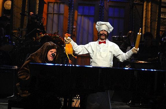 A good show, I thought (though seeing it live is always a more intense experience than watching it at home), with my favorites being the Douchebag of the Year sketch (I need a comedy pro like Ken Levine to explain to me why the word "douchebag" is just inherently funny, as it lacks a K sound), where Andy Samberg in particular made a magnificent douche; the Rowlf/Swedish Chef duet between Seth Rogen and Samberg (the audience was going nuts during the commercial break once we realized who they were dressed as), and Rogen and Kristen Wiig as those horrific children. Plus, it was just cool to see Chevy do Update again. I haven't had a chance to go back and rewatch the episode to see how it played on TV, save to fast forward through and check which sketches made the cut.