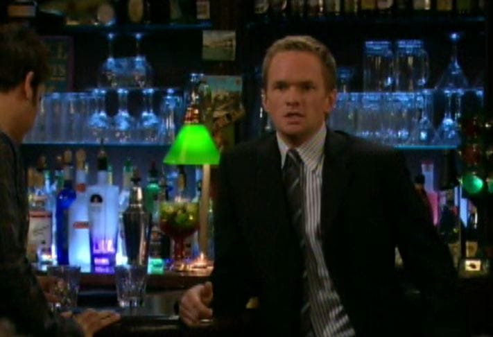 I've liked some of Barney's previous rules better than this one -- Lemon Law's hard to top, and Crazy/Hot did come with a visual aid -- but there were enough amusing moments to compensate, whether Marshall performing charades for "We just go across the hall!" or the gang ordering Barney to marry Wendy the Waitress to keep from losing the bar. And Neil Patrick Harris had some wonderful slapstick moments, with both his slide across the apartment to prevent Ted's exit and his slo-mo leap to slap the taste of burger out of Marshall's mouth.