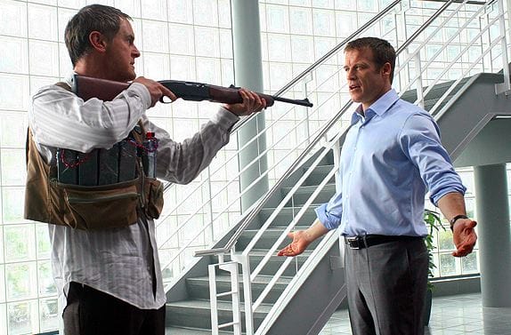 First, it's very strange to see Tricia Helfer playing the helpless, complaining woman in need of rescue here, since after all her years on "Battlestar Galactica," I could very easily see her as a female version of Chance telling her own whiny client to shut up while she kicks some butt. (Also weird seeing Mark "Duck Phillips" Moses as a disgruntled, gun-and-bomb-toting hostage taker.)