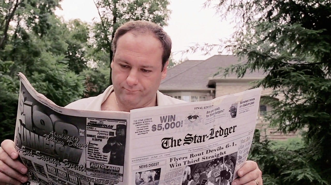 Still, I think about the day that someone at HBO called up me and Matt Zoller Seitz to ask if we could arrange for someone in our production department to speak to someone making props for a new show of theirs called The Sopranos, because one of the characters was a Star-Ledger subscriber and they wanted to make fake papers for him to read. We had no idea how big a deal that show would become, nor how iconic the image would be of Tony waddling to the end of his driveway at the start of each season to pick up his newspaper.
