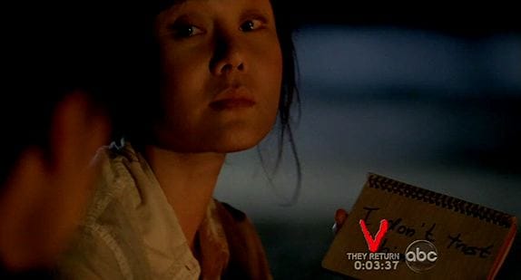 But because I watch "Lost" live like the rest of you, there was no way to avoid it, and it was ridiculous: between the large red "V" logo, and the ticking clock, it was impossible to not notice it, virtually ever moment it was on screen (which was everywhere except right before or after a commercial break), and in at least one case the stupid clock obscured the note Sun was writing to Jack. Well-done, ABC. Really freaking well-done.