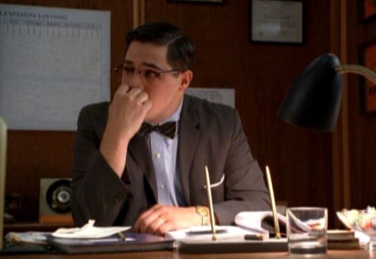 The episode's B-story involves the other man at Sterling-Cooper whose wife found out about his adultery at the end of season one, and who cut some kind of deal in between seasons to keep his marriage going: bespectacled, nebbishy Harry Crane. As with Don and Betty, we still don't know all the details of how Harry patched things up with Jennifer, but he does mention that "You told me you wanted me to tell you if I was upset." (Maybe he blamed the one-night stand with Hildy on being depressed over Kennedy beating Nixon?)