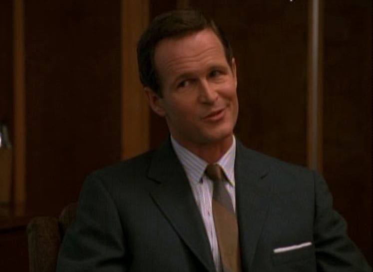 • The Belle Jolie exec who reluctantly turns down Harry's "Defenders" pitch is Elliot Lawrence, who invited Salvatore to dinner -- and then up to his hotel room -- in one of the best scenes in season one. Now that Salvatore has burrowed deep into the closet, note how cold he is to Elliot's innocuous question about how he's doing. Note also Elliot lamenting the fact that he doesn't work for a more progressive company; he's overtly talking about the abortion episode, but there are surely other ways in which Belle Jolie could be a friendlier place for him to work.