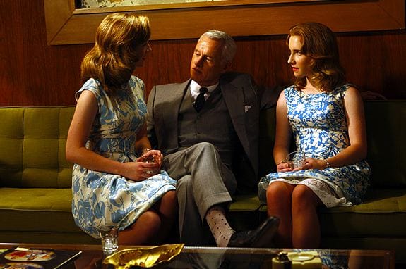 Roger's twin trouble: Boy, John Slattery has no problem playing appalling creeps, does he? I thought his golden shower-loving comptroller from "Sex and the City" couldn't be topped, but the entire sequence with the twins made me feel very dirty. Comparing Mirabelle to his daughter and sugggesting he wanted to suck her blood like Dracula was bad, but the squirmiest moment for me was when he asked them to kiss, and Mirabelle sadly noted that everyone asks them to do that. You want the perfect way to destroy a girl's self-esteem so she'll sleep with your ancient WWII veteran behind? Convince her that she's worthless except as part of a matched set.