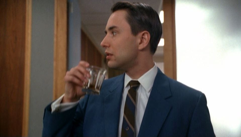 During season one, I occasionally complained about the mannered nature of Vincent Kartheiser's performance, how he often seemed to be trying too hard to seem of this era in a way that Hamm or Slattery or Michael Gladis didn't. Even at the time, I was willing to concede that this sort of fit the character -- that Pete is an empty suit playing at being a man -- and an episode like "Flight 1" (where I thought Kartheiser's shiftiness was perfect) supports that. Pete has the blue-blood bonafides, but nobody seems to have raised him, to have taught him a moral code or basic standards of behavior, and so he latches onto the behavior of those around him and does his best to copy it. (Note that his morbid Flight 1 joke follows several others.)