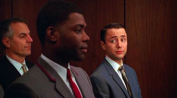 • Pete proves himself worthy of Duck's interest with his attempt to convince the Admiral execs to market their TVs to the black community. It's easy to see why Hollis might take Pete for a bigot - he's snooty and class-conscious, and in the season one episode where he and Peggy had a morning quickie in his office, he acts annoyed when Hollis lets a black custodian board the elevator - but we also know that for all his faults, Pete is the most forward-thinking guy at Sterling Cooper. If there's money to be made by marketing to a new demographic, Pete has no problem trying to make that money. But it's interesting to see that even after Hollis drops his guard, he's still not all that interested in who made his TV or why he bought it. With Evers' murder so fresh in everyone's memory, it's not surprising Hollis might find it frivolous to think about "The Beverly Hillbillies." Pete's dream of a homogeneous, integrated America where blacks and whites can have the same lifestyle, and the same aspirations, isn't necessarily Hollis' dream. On the other hand, Pete's right that Hollis watches baseball; when Marilyn Monroe died last season, Hollis was the one to note, "I keep thinking about Joe DiMaggio."
