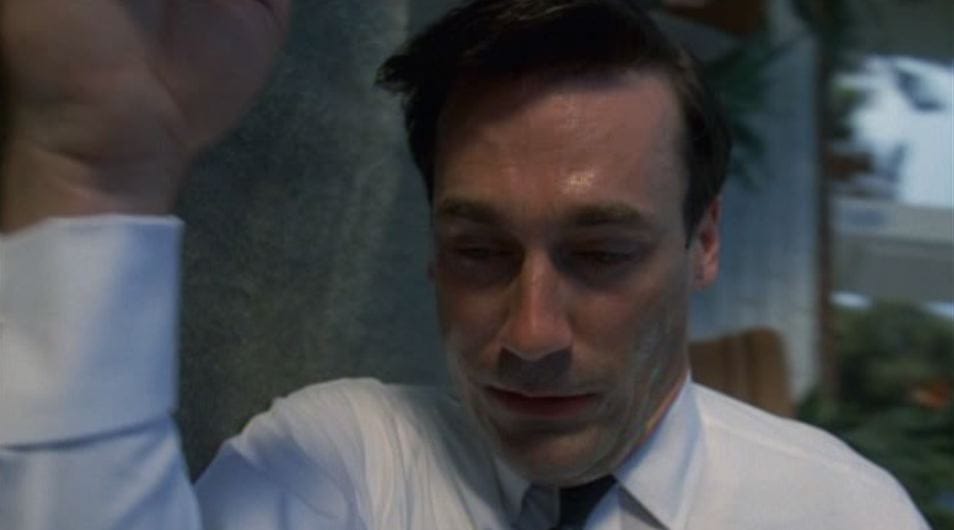 If it's uncomfortable to spend an hour with Don acting so quiet and passive, it at least matches the glimpses we got of him as Dick Whitman last season. Don Draper is master of all he surveys; Dick Whitman was a coward who pissed himself after a battle and tried to abandon his family to avoid getting into trouble at work. Don Draper is in charge at meetings; Dick Whitman collapses from heat exhaustion. (In a shot that I assume required a special kind of camera rig.)