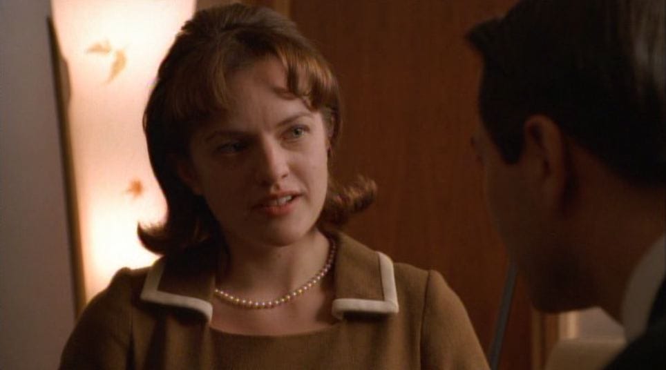 What an amazing scene, so expertly-played by Elisabeth Moss and Vincent Kartheiser. I've given them both a hard time in the past -- Moss for sometimes (mostly last year) being a little too inscrutable even by "Mad Men" standards, Kartheiser for trying too hard to seem like a man of 1962 (though, as I said in my "Flight 1" review, that approach really fits the way Pete's been written as an artificial human). But both were note-perfect here.