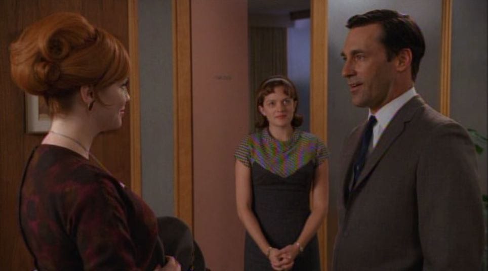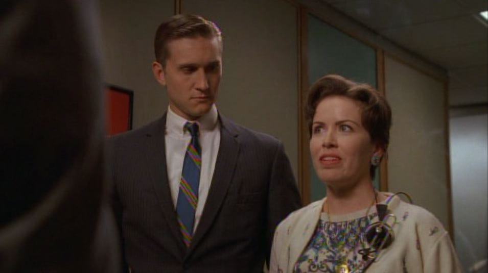 • One of my favorite small touches of the hour, meticulously set up over the previous two episodes: Don is the only guy in the office to immediately recognize that Peggy got a new haircut, and Peggy is so pleased by her mentor's attentiveness that she smooths her dress after he walks away. Almost as funny: Peggy's slightly defensive tone whenever she mentions the Popsicle account as justification for getting the office. ("Popsicle" is just a funny word.)