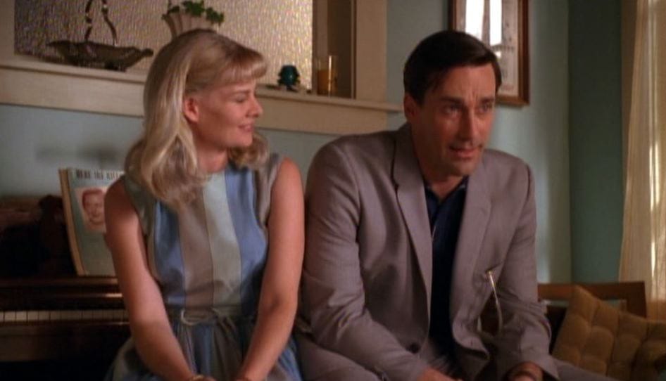 It's unclear precisely what Anna did for Don that made him thank her so profusely for making his new life possible. It may be as simple as her agreeing to keep his secret and to support his identity theft. But watching Don be around Anna in her beachside San Pedro bungalow was striking, because he was so unlike either of the two faces we're used to. He wasn't confident and reserved Don Draper, but nor was he cowardly Dick Whitman. He was a human being, capable of opening up to another human and making her a part of his life. Don was so relaxed around Anna, so unreservedly happy -- in both the 1962 scenes and the mid-'50s Christmas flashback, where he talked about Betty like he was a schoolboy with a crush -- that it's obvious just how much his secret is costing him. Because Anna knows who he really is -- and doesn't care -- Don can let down his guard, where he's terrified to open up to Betty, and as a result places her in a china cabinet and seeks sexual and emotional gratification elsewhere.